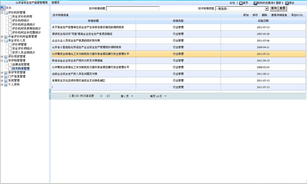 依據(jù)安全評(píng)價(jià)過(guò)程控制上報(bào)的數(shù)據(jù)對(duì)安評(píng)機(jī)構(gòu)業(yè)績(jī)、安全評(píng)價(jià)人員業(yè)績(jī)進(jìn)行智能統(tǒng)計(jì)匯總,并上報(bào)至國(guó)家安監(jiān)局??筛鶕?jù)安全評(píng)價(jià)機(jī)構(gòu)、年份、安全評(píng)價(jià)人員等條件進(jìn)行查詢(xún),查看、導(dǎo)出、打印安評(píng)機(jī)構(gòu)或安全評(píng)價(jià)人員的業(yè)績(jī)表;可以統(tǒng)計(jì)分析比較各安評(píng)機(jī)構(gòu)的業(yè)績(jī),為安全評(píng)價(jià)機(jī)構(gòu)的定期考核提供依據(jù)。