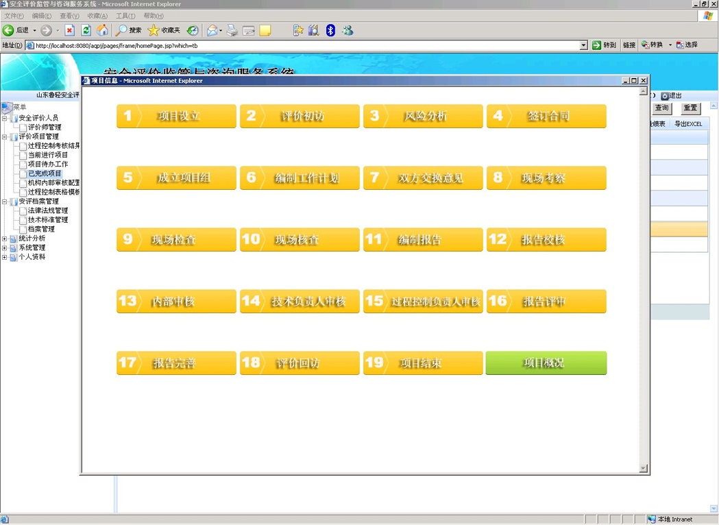 按照安評(píng)過(guò)程控制標(biāo)準(zhǔn),結(jié)合安全評(píng)價(jià)機(jī)構(gòu)的日常工作流程,對(duì)安全評(píng)價(jià)整個(gè)過(guò)程進(jìn)行網(wǎng)絡(luò)化地控制和監(jiān)管,根據(jù)風(fēng)險(xiǎn)分析、實(shí)施評(píng)價(jià)、報(bào)告審核、技術(shù)支撐、作業(yè)文件、內(nèi)部管理、檔案管理和檢查改進(jìn)八要素對(duì)所有評(píng)價(jià)項(xiàng)目過(guò)程進(jìn)行嚴(yán)格把關(guān),要求安全評(píng)價(jià)機(jī)構(gòu)將現(xiàn)有項(xiàng)目的進(jìn)度情況及時(shí)上報(bào)到系統(tǒng)中,規(guī)范安全評(píng)價(jià)機(jī)構(gòu)工作流程,實(shí)現(xiàn)安全評(píng)價(jià)過(guò)程控制的信息化,在方便安全評(píng)價(jià)機(jī)構(gòu)內(nèi)部管理的同時(shí)有利于監(jiān)管部門(mén)對(duì)安全評(píng)價(jià)機(jī)構(gòu)的評(píng)價(jià)行為進(jìn)行實(shí)時(shí)動(dòng)態(tài)的監(jiān)督管理。