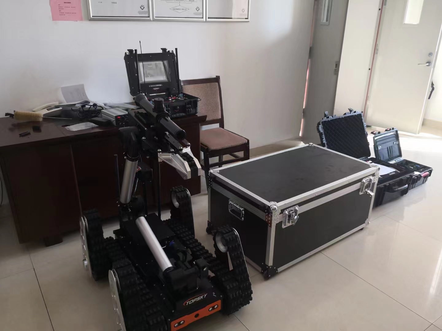 排爆機器人主要是用來處理爆炸物相關(guān)工作的排爆式機器人,也可用于偵察人難以達(dá)到的地形的一種機器人。6自由度排爆機械手能實現(xiàn)不同角度旋轉(zhuǎn),最大可抓舉55KG的重物,機械臂裝載爆炸物銷毀器,可現(xiàn)場摧毀爆炸物,底盤采用履帶+雙擺臂結(jié)構(gòu),能適應(yīng)各種地形快速作戰(zhàn)部署。同時機器人配備有線控制可以網(wǎng)絡(luò)干擾情況下通過有線遠(yuǎn)距離作業(yè)。排爆機器人可與配件一同使用,例如銷毀器,爆炸物的遠(yuǎn)程引爆控制系統(tǒng)等。