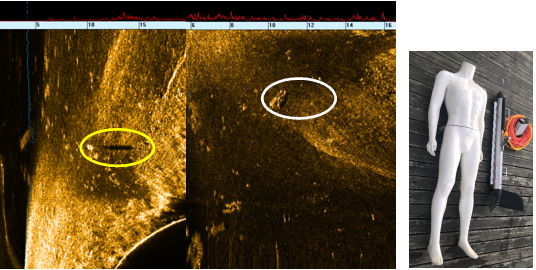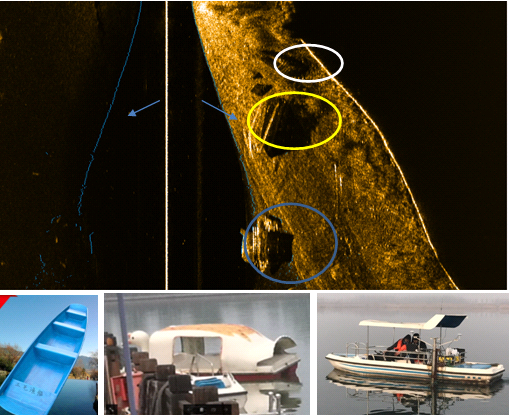 其中,藍(lán)色箭頭指向藍(lán)色線條為自動(dòng)檢測(cè)的水底線,三艘沉船,分別對(duì)應(yīng)實(shí)物如下,小船約為3米長,大船約為5米長。