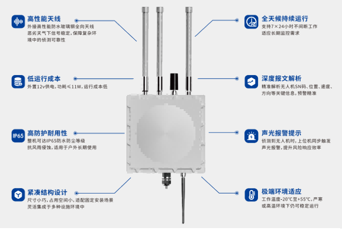 1.該產品是一款集成多種通信模式和能源供應的智能無人機探測設備,采用外置玻璃鋼全向天線,可以對市面上常見消費級無人機實現精準預警;