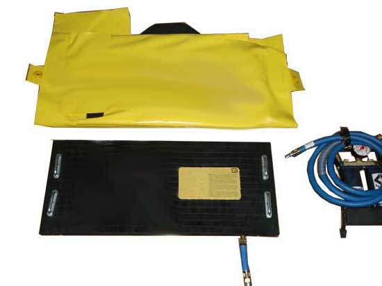2種規(guī)格(旋轉(zhuǎn)扣型,重量25kg,帶子導(dǎo)向扣型,重量16.9kg),密封面積50×30厘米,軟橡膠材質(zhì),配有快速充泄氣切換接口,1個(gè)帶安全壓力表的腳踏高壓氣泵。適用于在地形復(fù)雜的狹窄空間內(nèi)密封直徑在5至48厘米的管道及圓形容器的裂縫。
